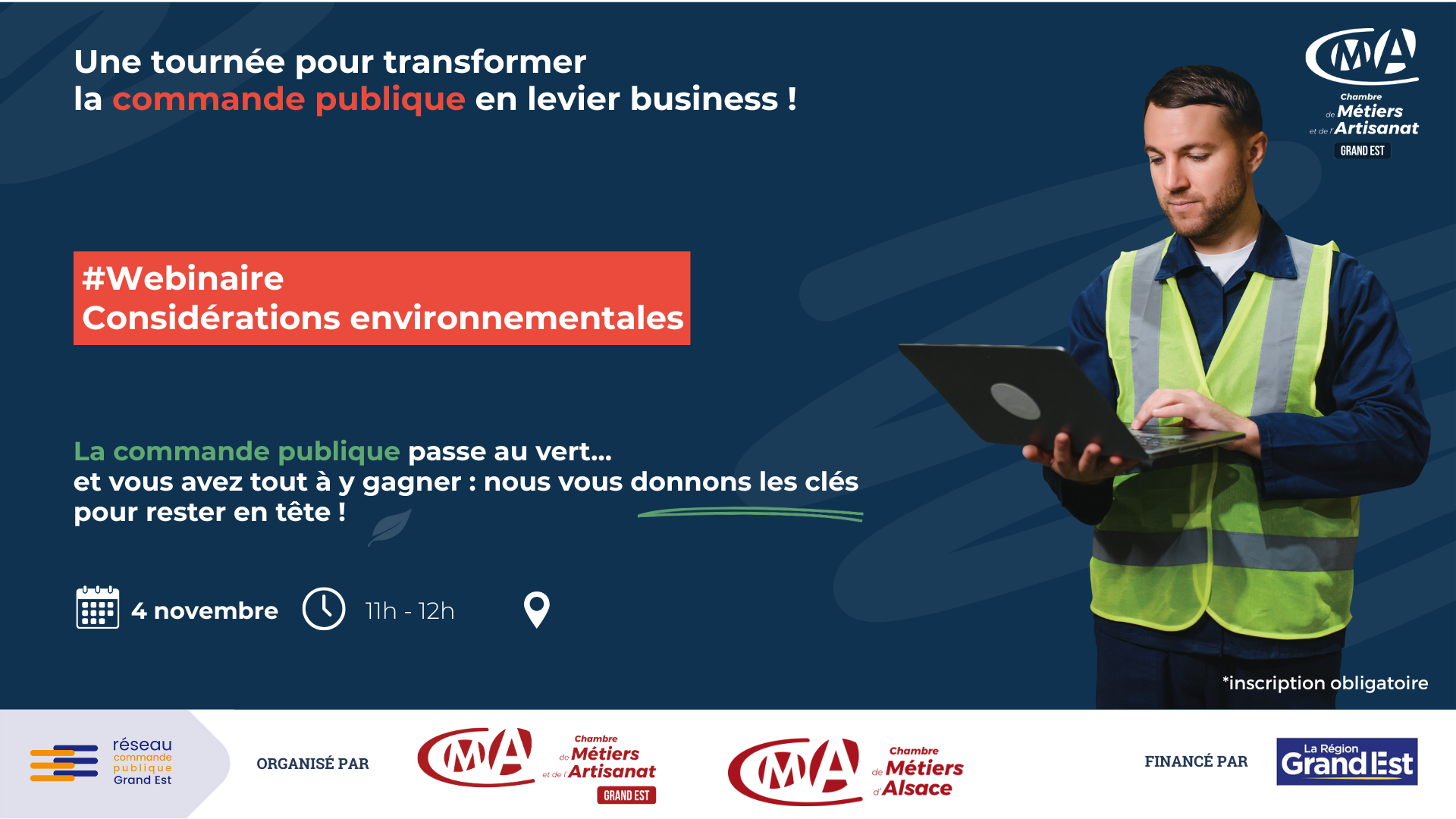 Vos conseillers référents “marchés publics” de la Chambre de Métiers et de l’Artisanat de Région Grand-Est et de la Chambre de Métiers d’Alsace resteront mobilisés pour vous accompagner sur le sujet à l’issue du webinaire.