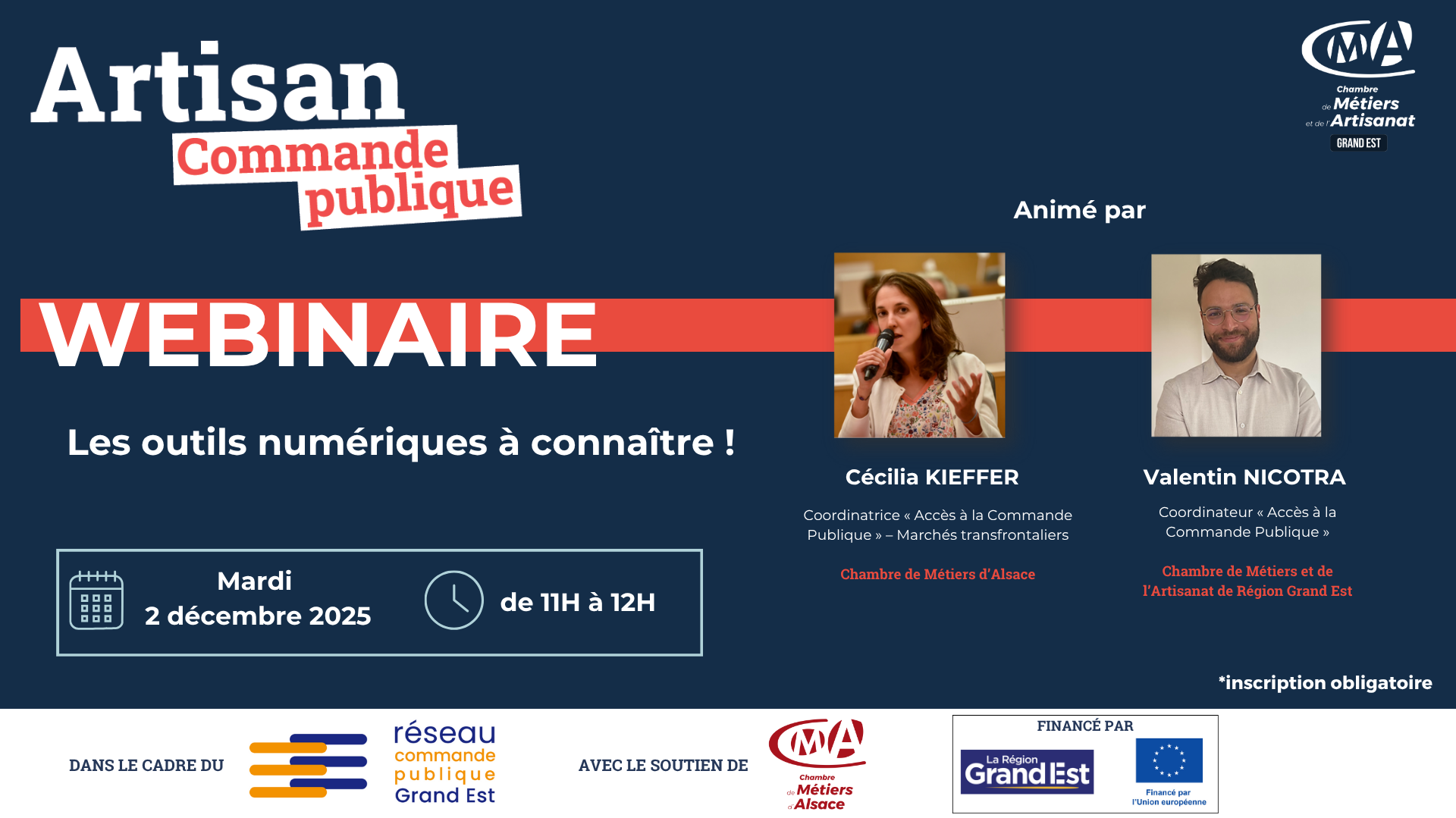 La Chambre de Métiers d’Alsace et la CMA de Région Grand Est vous invitent à prendre part au webinaire “#Artisan Commande publique : les outils numériques à connaître“, le 2 décembre 2025 de 11h00 à 12h00.