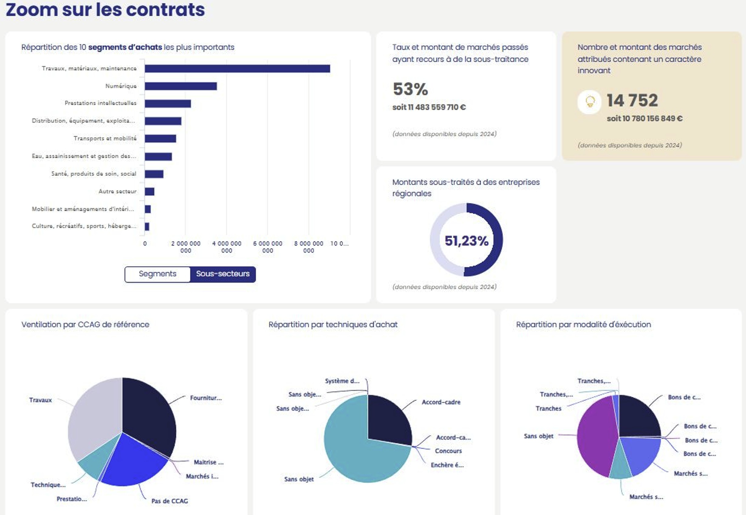 L’Observatoire régional met à disposition une palette d’outils puissants pour décrypter la commande publique dans le Grand Est, à la fois en termes de volumes, de pratiques et d’impact économique ou environnemental. Il offre d’abord des tableaux de bord interactifs, permettant de visualiser en quelques clics les volumes d’achats par territoire, par acheteur ou par secteur d’activité. Ces tableaux permettent également d’analyser les procédures utilisées (MAPA, appels d’offres, etc.), de suivre la part attribuée aux entreprises régionales et les considérations sociales et environnementales dans les marchés attribués Les données sont filtrables et comparables, offrant une vraie capacité d’analyse stratégique.